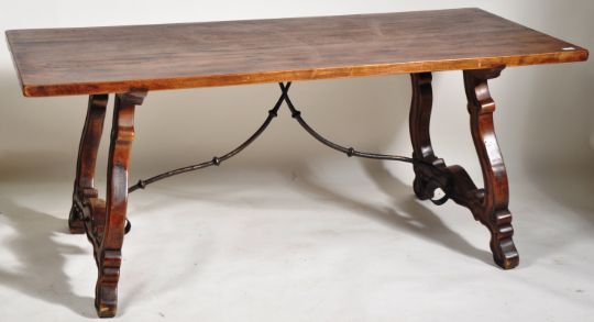 A 19th Century Spanish walnut and wrought iron refectory dining table having a thick solid walnut planked top raised over carved shaped trestle type leg supports united by wrought iron metal work. Measures approx; 76cm x 180cm x 80cm