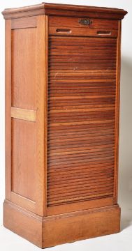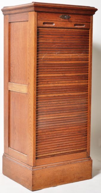 An early 20th Century vintage industrial oak tambour fronted music cabinet having a working roller action tambour door with a series of pull out slides and metamorphic lectern to top. Complete with working lock & key. Measures approx; 113cm x 48cm x 41cm.