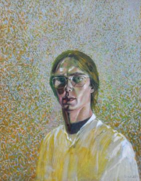 John Tweddle - American Artist b1938 - An original pastel & oil mixed media portrait painting study depicting a young man in shirt with thin rimmed glasses set to a well detailed ground. Unframed/ Signed Tweddle to lower right corner. Measures approx; 56cm x 51cm.