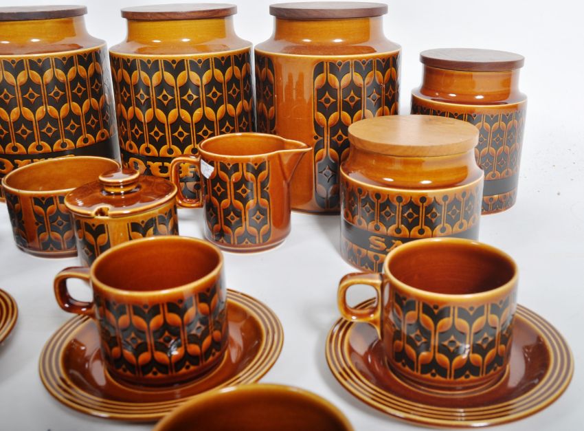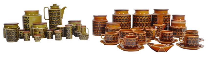 John Clappison - Hornsea - Heirloom - An extensive collection of original vintage retro 1970's pottery kitchenware to include many lidded storage pots, teapot, tea cups, condiments, plates, saucers and much more. In green & brown colourway. Stamped to bases.