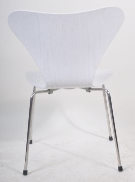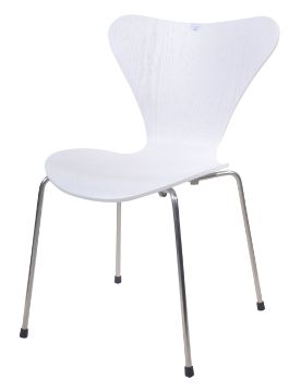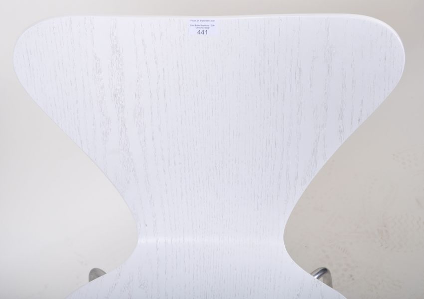 After Arne Jacobsen - A contemporary 21st Century shaped formed moulded ply dining / desk side chair in the manner of the Serie 7 designed chairs. White finish with all being raised on chrome tubular supports. Good condition. Measures approx; 75cm x 50cm x 46cm.