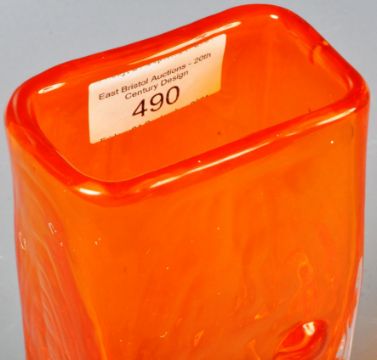 Geoffrey Baxter - Whitefriars - A Textured range Mobile Phone vase, pattern number 9670 in tangerine orange. The vase of rectangular form with twelve textured circles acting as the mobile phone buttons. Grounded pontil to base. Measures 17cm tall. No visible damage.