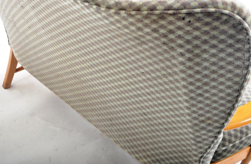 Lucian Ercolani - Ercol - Model 312 - A retro vintage mid 20th Century 1956's beech and elm wingback two seater sofa setter having a sage green button back upholstery to the backrest. Upholstered seat cushions and spare seat cushion below with all being raised on tapering splayed supports united by stretchers. Wear commensurate with age, with new webbing, overall good condition. Measures approx; 93cm x 137cm x 66cm. Match armchairs can be seen in lot 570.
