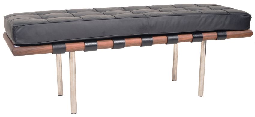 After Ludwig Mies van der Rohe - Barcelona Bench - A contemporary two seater Barcelona bench having a black leather cushioned top over a slatted wooden base raised on chrome tubular legs. Measures approx; 49cm x 131cm x 42cm.
