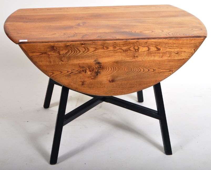 Lucian Ercolani - Ercol - 377 - An original vintage 1960's retro beech and elm dining suite comprising of a model 377 drop leaf dining table with 'x' stretcher along with a matching set of four fleur de lys hoop back Windsor dining chairs. Each piece having a light elm top or seat with ebonised painted legs and back rest. Measures: 73cm x 113cm x 63cm. Leaves measure 31cm.
