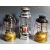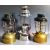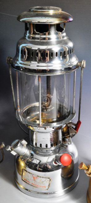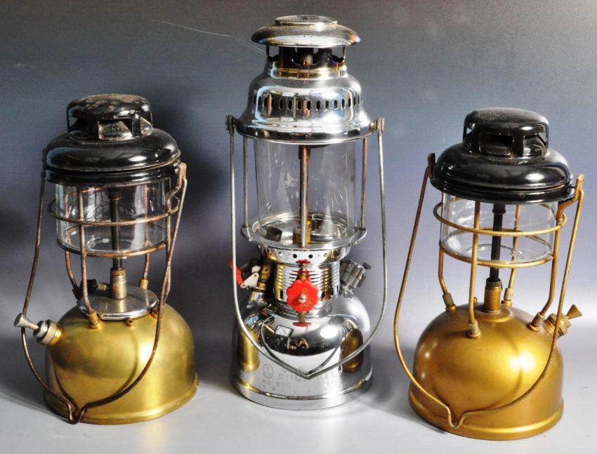 Tilley Lamps - Two vintage 20th Century Tilley paraffin lamps of typical form with each having black enameled covers with caged glass wicks centres and gold tone bases. Together with another Anchor made lamp. All having carrying handles atop. Wear commensurate with age, overall good. Tallest measures approx; 42cm x 18cm.