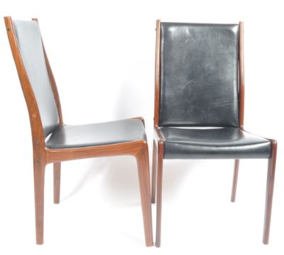 Johannes Andersen - Uldum Møbelfabrik - A matching set of eight retro vintage 20th Century Danish wood and leather dining chairs. Each dining chair with show wood frames and padded black leather back and seat rests with each being raised on tapering supports. Makers labels present. Condition; wear throughout mostly to the leather with signs of minor repairs (mostly re-staining and replacement screws). Each chair measures approx; 90cm x 44cm x 46cm.