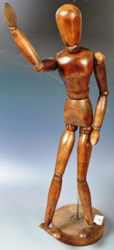 A large retro vintage 20th Century wooden articulated artist's mannequin table / desk top figurer supported by a single metal steam raised on a circular base. Measures approx; 55cm tall.