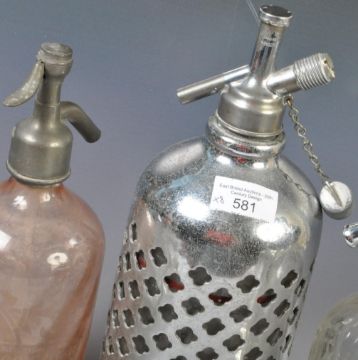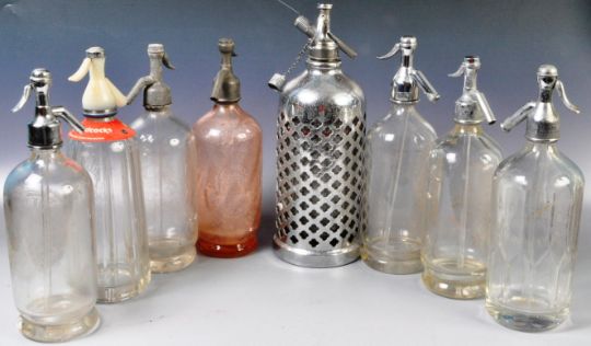 A collection of eight vintage glass soda siphon dating from the early half of the 20th Century with most having chromed tops with etched glass bodies. Some bearing Talbot & Co others with Bartholomew,  May & Sons example, another with a chrome case etc. Wear commensurate with age, overall good. Tallest measures approx; 34cm.