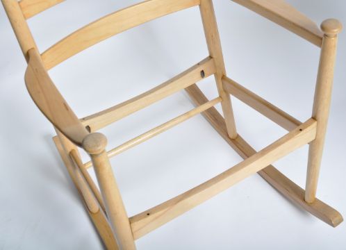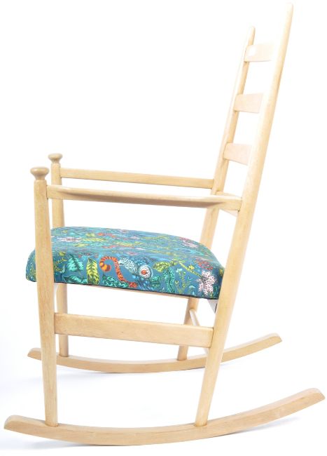Niels Eilersen - A retro vintage 1960's Danish beech and elm rocking chair having a vibrant Emma Shipley Amazon print fabric. Fully restored beech and bent ply frame with ladder back, shaped arms and sleigh bow rockers. Measures approx; 100cm x 62cm x 60cm.