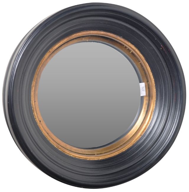 A contemporary Hollywood Regency circular wall hanging mirror having an ebonised slipped frame with gilt highlights to the centre and convex mirror panel center. Measures approx; 51cm diameter.