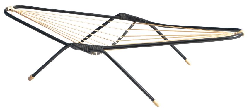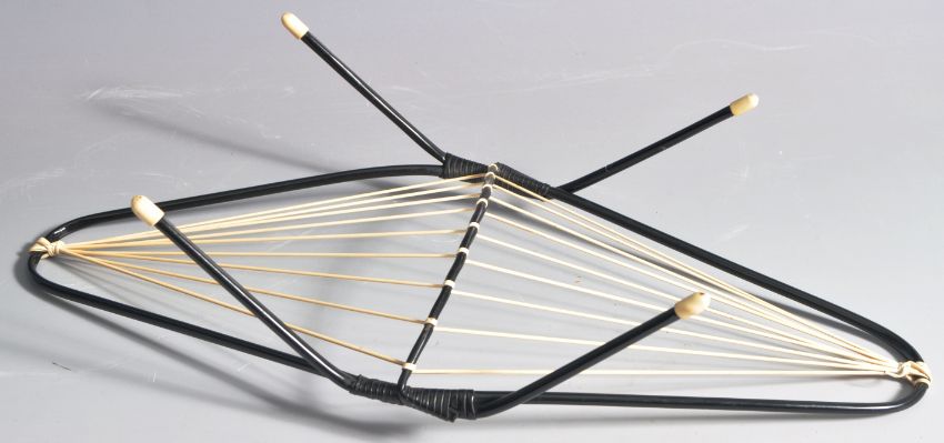 A retro vintage 1960's atomic wirework fruit bowl / basket of lozenge shape form having a black metal frame with suspended centre. All raised on A-frame supports. Wear commensurate with age, overall good. Measures approx; 8cm x 41cm x 18cm.