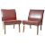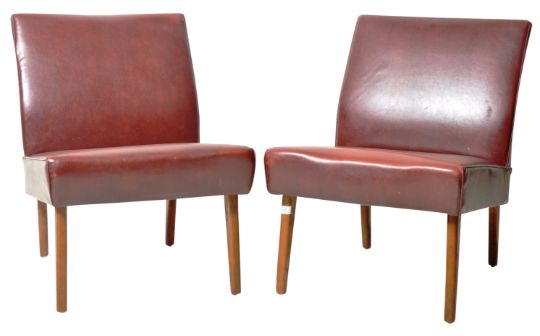 A matching pair of retro vintage mid Century beech and chestnut brown leather upholstered easy / lounge chairs. Each having padded back and seat rests with studded leather with each raised on tapering splayed supports. Wear commensurate with age, mostly to the legs, overall good. Each measures approx; 72cm x 51cm x 56cm.