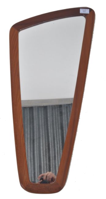 A retro vintage 1960's teak framed hang mirror of harp shape housing single mirrored panel. Hanging wire to verso. Wear commensurate with age, overall good. Measures approx; 76cm x 34cm.