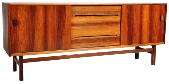 Nils Jonsson - Hugo Troeds of Sweden - An original retro vintage 1960's Swedish rosewood sideboard credenza comprising of a central bank of four drawers flanked by a sliding cupboard drawer to both ends. All raised on square legs. Measures approx; 79cm x 190cm x 43cm.