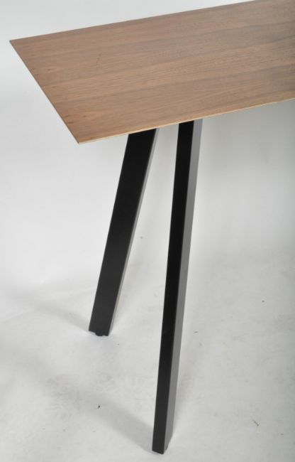 A contemporary modernist minimalist oak console table / hall table comprising of a large long wooden top raised on long hairpin legs. Measures approx; 74cm x 180cm x 44cm.