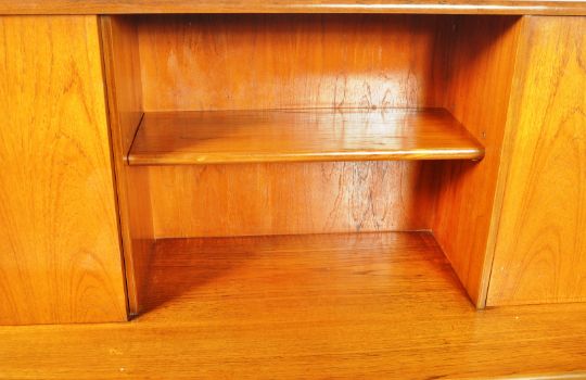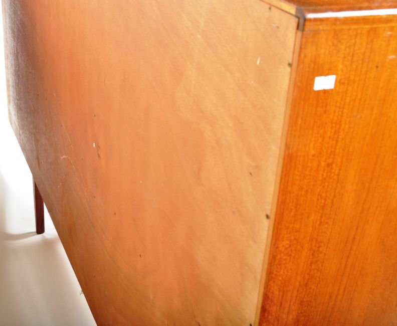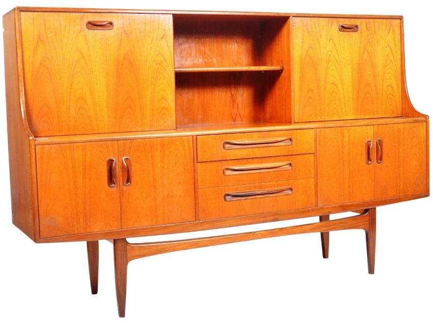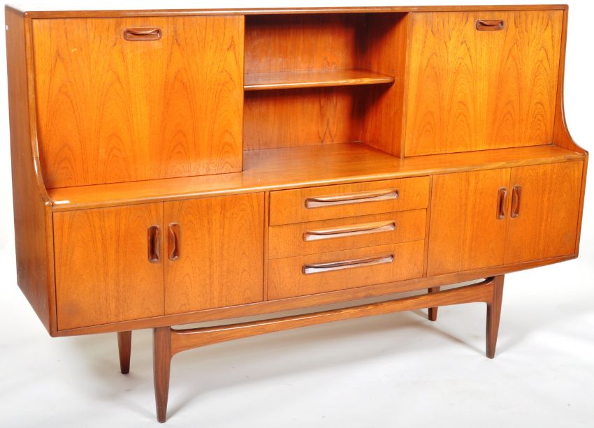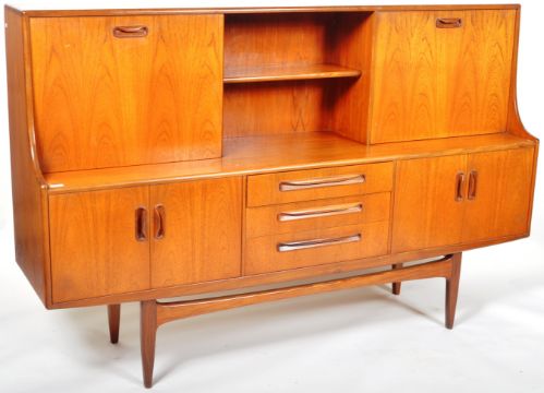 Victor B. Wilkins - G Plan - Fresco - An original retro vintage 1960's teak wood sideboard highboard credenza comprising of two upright cabinet / cocktail sections with central shelved section over a central bank of drawers flanked by twin cupboard sections. All raised on shaped supports. G Plan label present. Measures approx; 122cm x 188cm x 46cm.