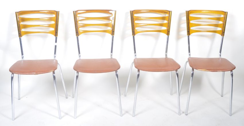 Keron - A set of four retro vintage 1970's stacking dining chairs / side chairs having a shaped translucent formed plastic back rests raised on chrome tubular supports with tan seats. Measures approx; 83cm x 135cm 34cm.