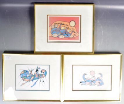 Norval Morrisseau (Ontario / Canada, 1932 - 2007)  A set of three retro vintage 20th Century signed lithograph prints entitled Flock of Looms, Returning Home and Loon Family. Each featuring vibrant stylised animals. Signed to corners. Set to framed and glazed. Measures approx; 28cm x 34cm.