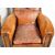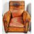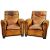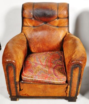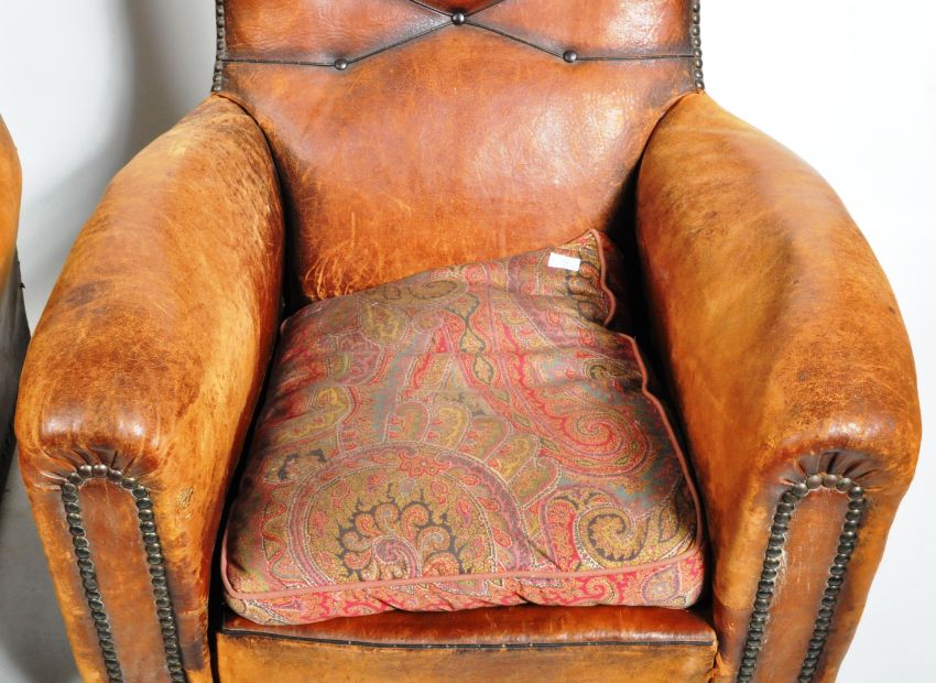 A matching pair of vintage 20th Century Art Deco leather club armchairs / fireside chairs. Each being upholstered in a tan brown leather with scroll armrest and brass stud back. Paisley upholstered seat cushions Each being raised on oak stub supports. Wear commensurate with age. Each measures approx; 90cm x 84cm x 90cm.