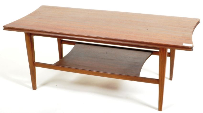 Richard Hornby - Fyne Ladye Furniture - A retro 20th Century teak wood coffee table retailed by Heals having a shaped top with carved edging and second tier / magazine rack below. All being raised upon tapering supports. Measures approx; 36cm x 91cm x 41cm.