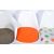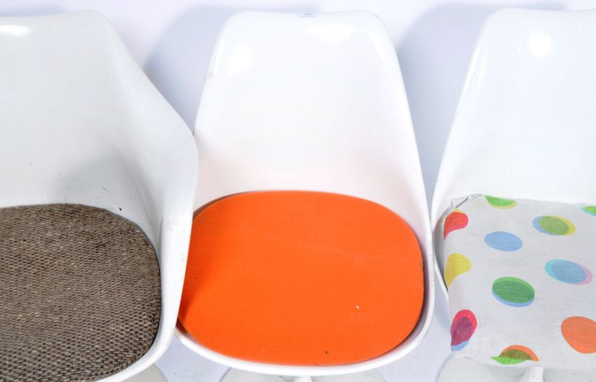 A set of five retro vintage 20th Century tulip style dining chairs in the manner of Eero Saarinen in 1956 for Knoll International. Each chair of fibreglass construction with white enamelled aluminium and varied upholstery drop in seat cushions. One chair being a carver armchair. Condition; age related wear throughout, mostly to the bases, all structurally sound. Each chair measures 83cm x 66cm x 49cm.