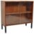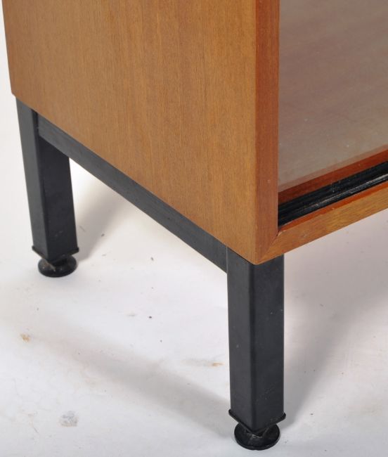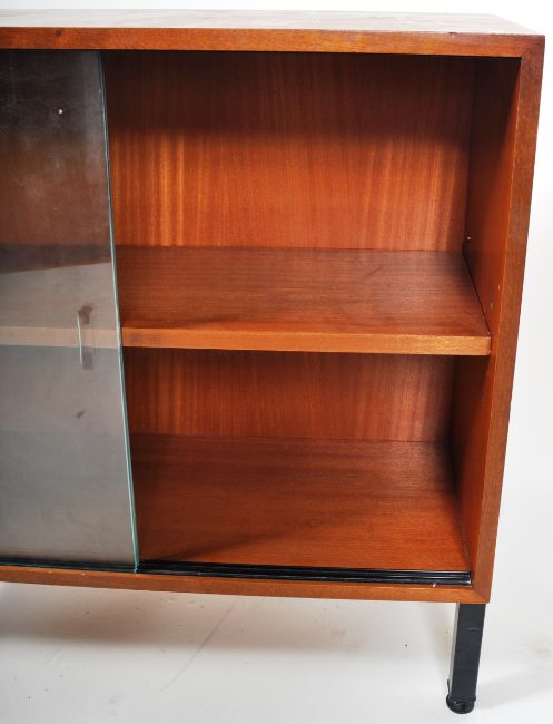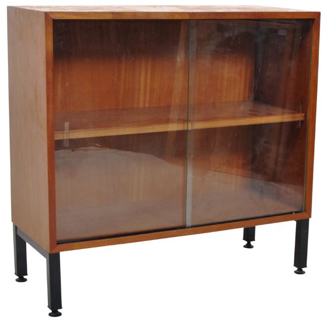 Abbess - A mid Century teak bookcase / display cabinet having a single adjustable shelved interior with twin sliding glass doors. All being raised on straight black metal legs. Wear commensurate with age, good condition. Measures approx; 73cm x 76cm x 31cm.