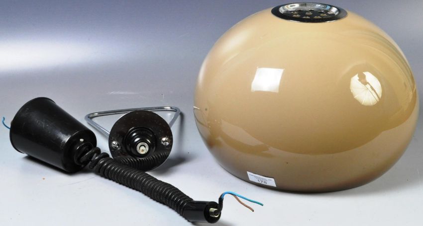 Harvey Guzzini - A retro vintage 1960's Italian rise & fall ceiling light lamp having a brown and white acrylic shade with black rise & fall cord. Measures approx; 30cm.