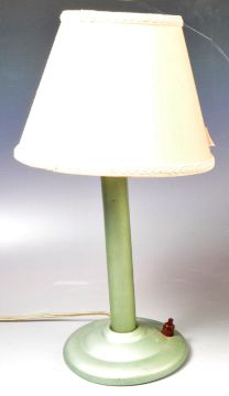 A retro vintage mid 20th Century enamel / metal table desk lamp light having a central tubular column over stepped circular base with push switch. Complete with shade. Measures approx; 38cm tall.