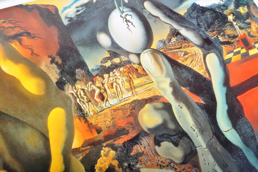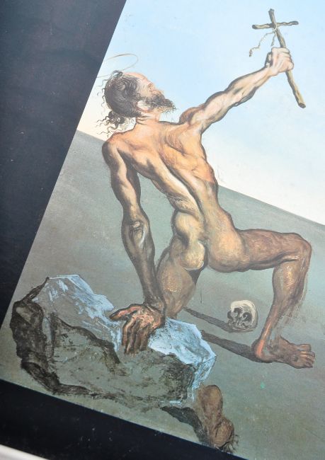 Salvador Dali - The Temptation of St Anthony / Metamorphosis of Narcissus- Two mid Century coloured prints on board of oil on canvas paintings. The Temptation of St Anthony set within a metal silver frame and the other unframed. Framed example measures approx; 69cm x 99cm.