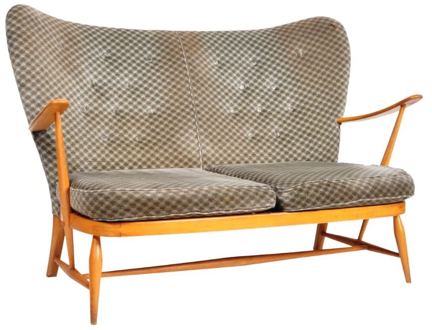 Lucian Ercolani - Ercol - Model 312 - A matching pair of retro vintage mid 20th Century 1956's beech and elm wingback easy / lounge armchairs having a sage green button back upholstery to the backrests. Each arm chair having upholstered seat cushions with each being raised on tapering splayed supports united by stretchers. Wear commensurate with age, with new webbing, overall good condition. Each chair measures approx; 86cm x 74cm x 59cm.