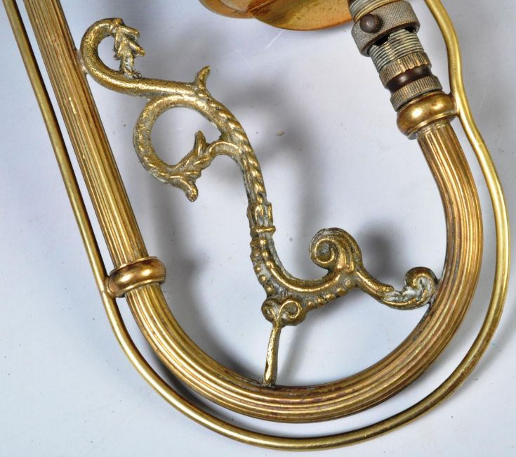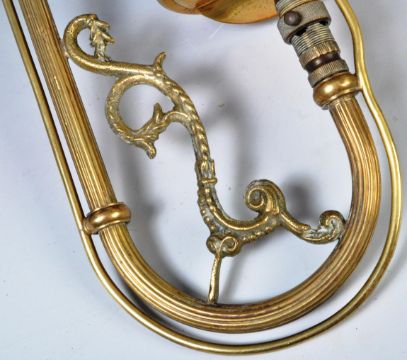 An early 20th Century brass wall sconce gas lamp light having a shaped glass floral shade with scrolled brass arm. Converted to electricity. Measures approx; 34cm.