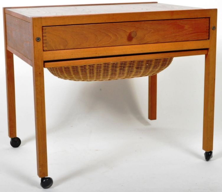 A retro vintage 20th Century Danish teak wood sewing work box table / trolley of rectangular form. Single fully appointed fitted drawer over a front sliding basket compartment below. Raised on straight supports upon castors. Measures approx; 54cm x 61cm x 45cm.