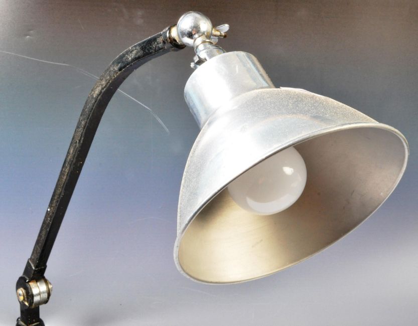A retro vintage 1940's French Industrial factory work desk lamp light having an enamel pendant shade raised on cast metal black adjustable arm with shaped base. Measures approx; 70cm tall.