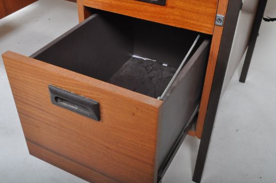 A retro vintage 20th Century 1970's teak office twin pedestal desk having rectangular bowed top with the left pedestal having a bank of three drawers and two the right a bank of two. Each drawer having recessed handles with all raised and supported on metal legs. Wear commensurate with age, overall good condition. Measures approx; 72cm x 185cm x 89cm.