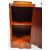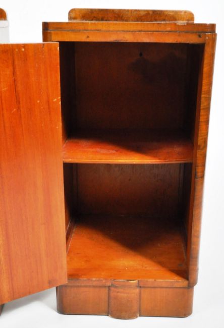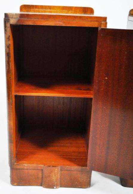 A pair of vintage 1930's Art Deco walnut bedside tables / cupboard chests of upright pedestal form with each having a bowed walnut veneered panel front to the door and back rail a top. Each door opens to reveal a shelved interior and being raised upon plinth bases. Wear commensurate with age with each having wear to the veneer in places but overall structurally sound. Each measures approx; 72cm x 35cm x 41cm.