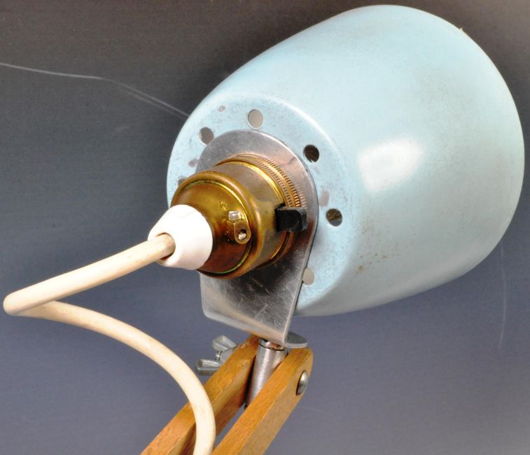 Terence Conran - Habitat - Mac Lamp No.8 - A retro vintage 1960's adjustable anglepoise desk / table work lamp light by Terence Conran for Habitat, Maclamp. The lamp having a pale blue conical shade on a twin wood arm support and blue finished base. Measures approx; 55cm.