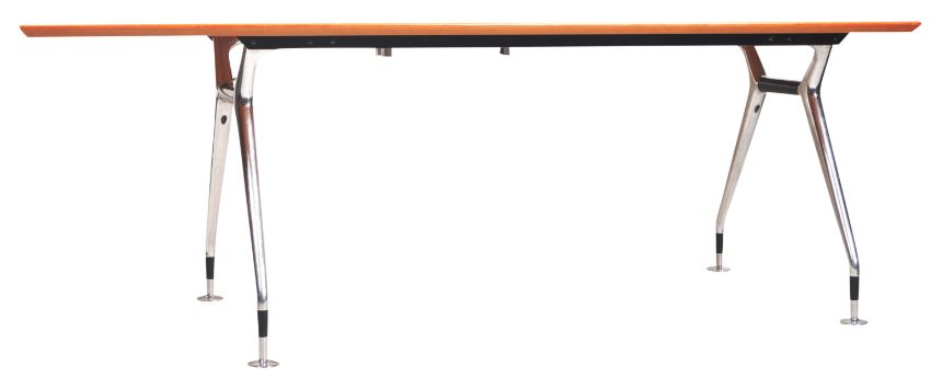 Herman Miller - A large contemporary 21st Century partners desk having a square table top with inbuilt revolving plug sockets, overhanging sides raised on tubular legs. Would seat six Mirra 2 chairs. Measures approx; 72cm x 199cm x 100cm.