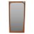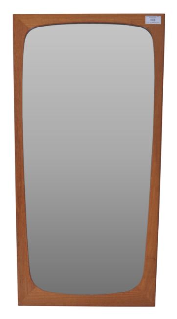 A mid Century teak framed tapering rectangular hanging wall mirror housing a single bevelled edge mirror panel. Hanging wire to verso. Wear commensurate with age, overall good. Measures approx; 70cm x 33cm.
