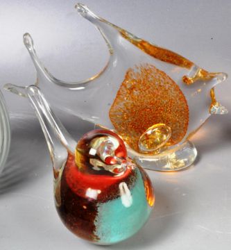 A mixed collection of retro 20th Century studio art glass animal figures with some of Italian origin to include a Venetian Glass fish with orange tones, candy striped cockerel, snail, turquoise starfish, birds etc. Tallest measures approx; 7cm x 14cm.