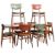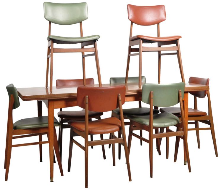 A retro vintage mid 20th Century formica topped extending dining table and matching eight chairs. The table of rounded rectangular form with extending draw-leaves to each with all being raised on beech supports. The chairs consisting of four faux leather red examples and four green examples with beech frames. Wear commensurate with age, overall good. Table measures approx; 75cm x 140cm x 76cm. Chairs measures approx; 81cm x 44cm x 45cm.