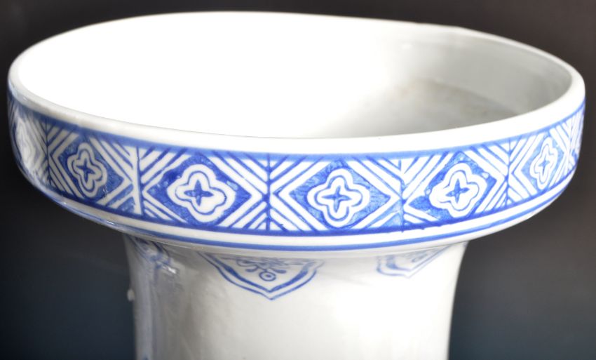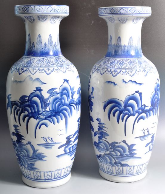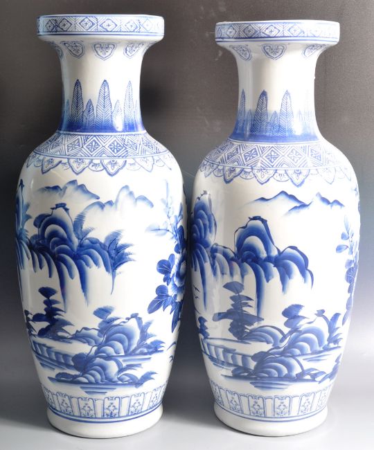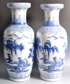 A pair of decorative 20th Century Chinese blue and white porcelain vases of large size having traditional decoration depicting birds and trees in blue to a white ground. Measures approx; 62cm tall.