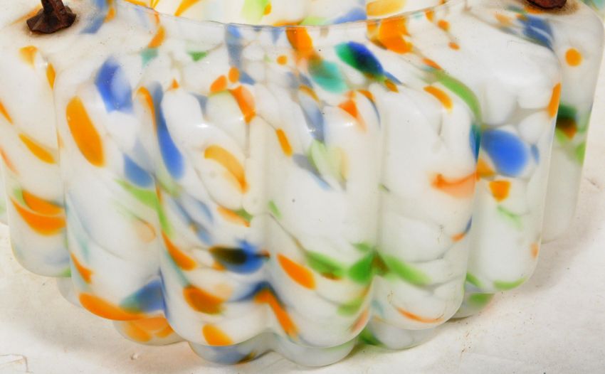 Two vintage 20th Century 1930's Art Deco hanging ceiling light lantern lamp shades of glass construction having mottled multi coloured decoration with one having hand painted floral detailing. One still retaining the metal hooks. Largest measures approx; 18cm x 36cm.