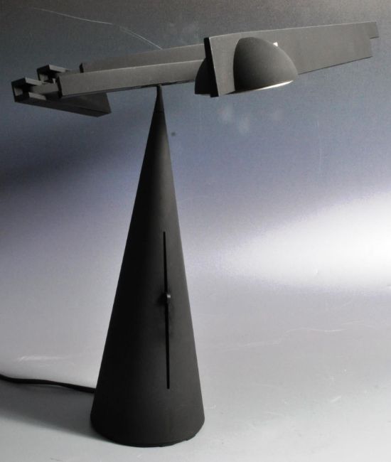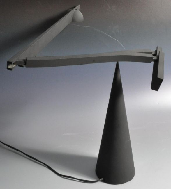 Mario Barbaglia and Marco Colombo - Italiana Luce - A retro 20th Century 1980's Italian table / desk lamp light of black polycarbonate and steel construction. Adjustable cantilever scissor arm with all being raised on a conical base. Makers marks to the base. Sold as untested, overall good condition. Measures approx; 40cm x 54cm.