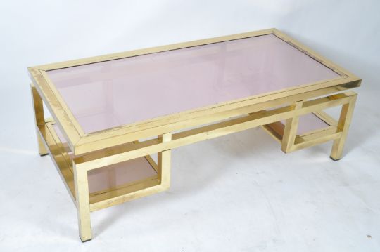 Guy Lefevre (1933-2018) - Maison Jansen - An original retro vintage 1960's French high end design brass and lucite coffee table having a large inset rectangular top with two smaller glass table tiers. All raised on thick brass angular legs and supports. Some minor tarnishing to the brass and wear / scratches to the smoked lucite film finish. An impressive piece. Measures approx; 14cm x 120cm x 60cm.