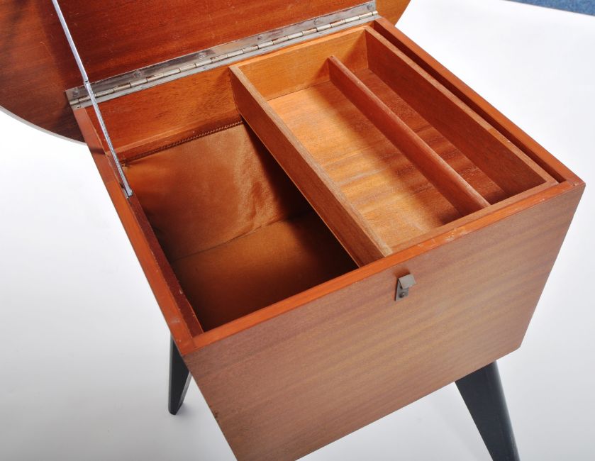 A retro vintage 1960's teak wood sewing box having a circular hinged table top opening to reveal a fitted interior. The box section raised on ebonised tapering legs. 51cm x 56cm.
