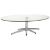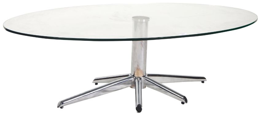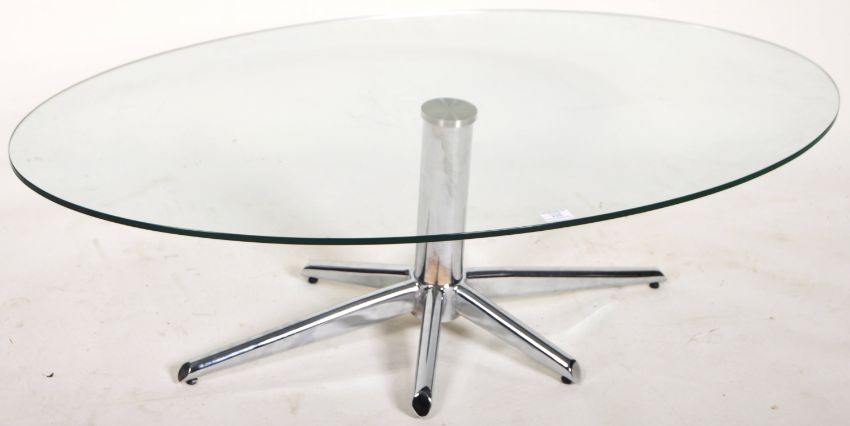 A contemporary designer chrome and glass coffee table having a clear oval glass top supported by a single stem chrome column. All being raised on angular chrome supports of varying sizes. Good condition. Measures approx; 37cm x 120cm x 70cm.