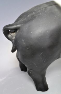 A contemporary shop display / butchers advertising point of sale display pig constructed from hard acrylic moulded in a standing position with painted facial features. The pig being black with a white strip. Measures approx; 30cm x 58cm x 21cm.