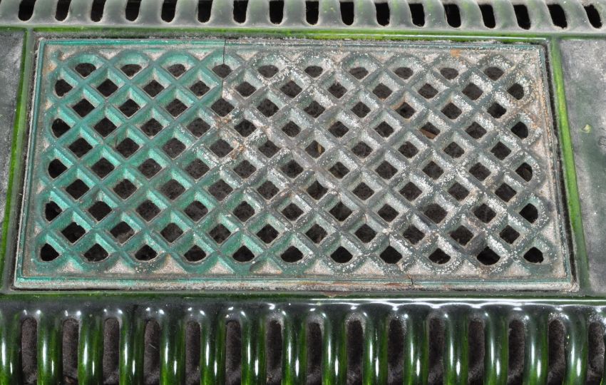 Faunus - A vintage 20th Century French cast iron enamel stove having lattice worked panels throughout with an oval makers plaque to the front. Raised on cabriole legs. Wear commensurate with age, overall good. Measures approx; 50cm x 47cm x 28cm.