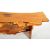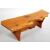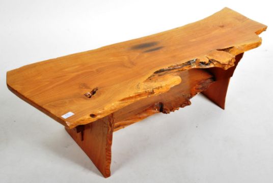 A retro vintage 20th Century ' living edge ' rustic wooden coffee table having a shaped table top raised on trestle type legs united by a central pegged stretcher. Measures approx; 39cm x 117cm x 43cm.